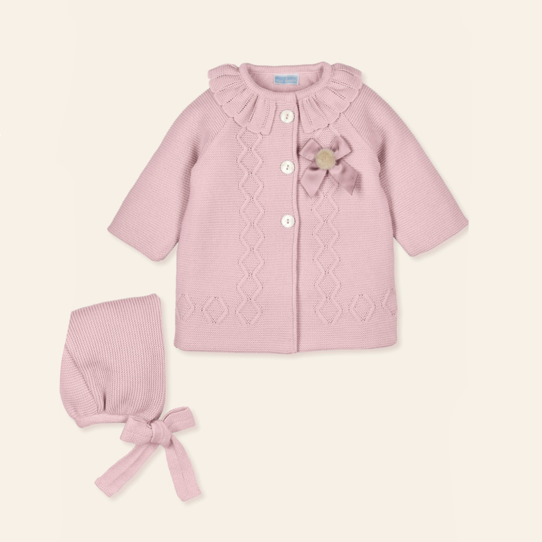Abrigo de punto con adorno y capota en color malvaIdeal para un detallito presentado en una tierna y delicada caja de regalo.