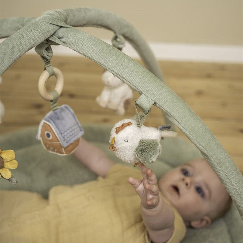 Fomenta la exploración. Desafiará a tu pequeño a moverse, alcanzar y agarrar con esta alfombra de actividades cautivadora. La alfombra es super suave, tiene forma redondeada en la base con un grosor de 2 cm, lo que la hace muy confortable y está inspirada en la estética de la granja de la colección Little Farm, con 5 diferentes suaves juguetes colgantes que mantendrán a su bebé entretenido y desarrollará la coordinación ojo-mano.