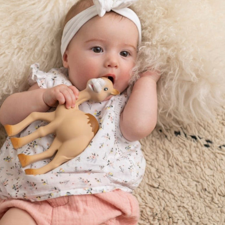 La vista: Los bebés en sus primeros meses tienen la visión algo limitada. Estos solo pueden diferenciar grandes contrastes de color, por lo que las manchas de Sophie de tonalidad oscura y distribuidas por todo el juguete, le ayudarán a estimular su vista. Además, gracias a esto, el niño puede reconocer de manera rápida al juguete y sentirse tranquilo al ver un objeto que le resulta familiar.