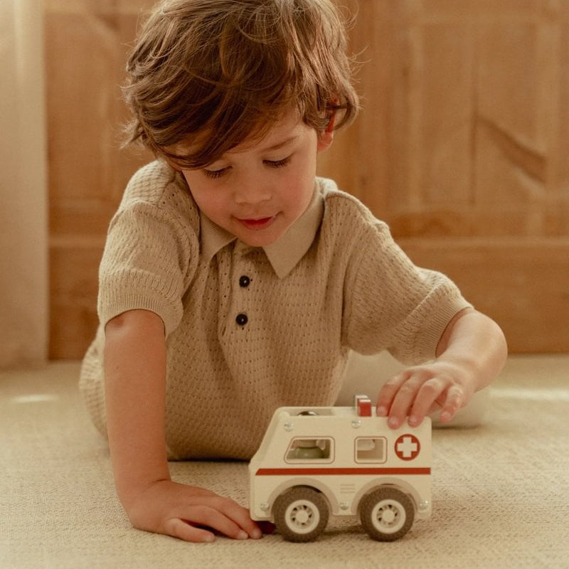 ¡Sirena, hora de ayudar! Esta ambulancia de madera con ruedas de goma transporta rápidamente a los pacientes al hospital. Dentro hay espacio para un paciente y el set incluye una enfermera de madera. Conduce lo más rápido posible a urgencias, lleva al paciente adentro y cuida bien a todos. Esta ambulancia de juguete hace que el juego de roles sea aún más divertido. ¿Ayudarás a alguien a recuperarse hoy?