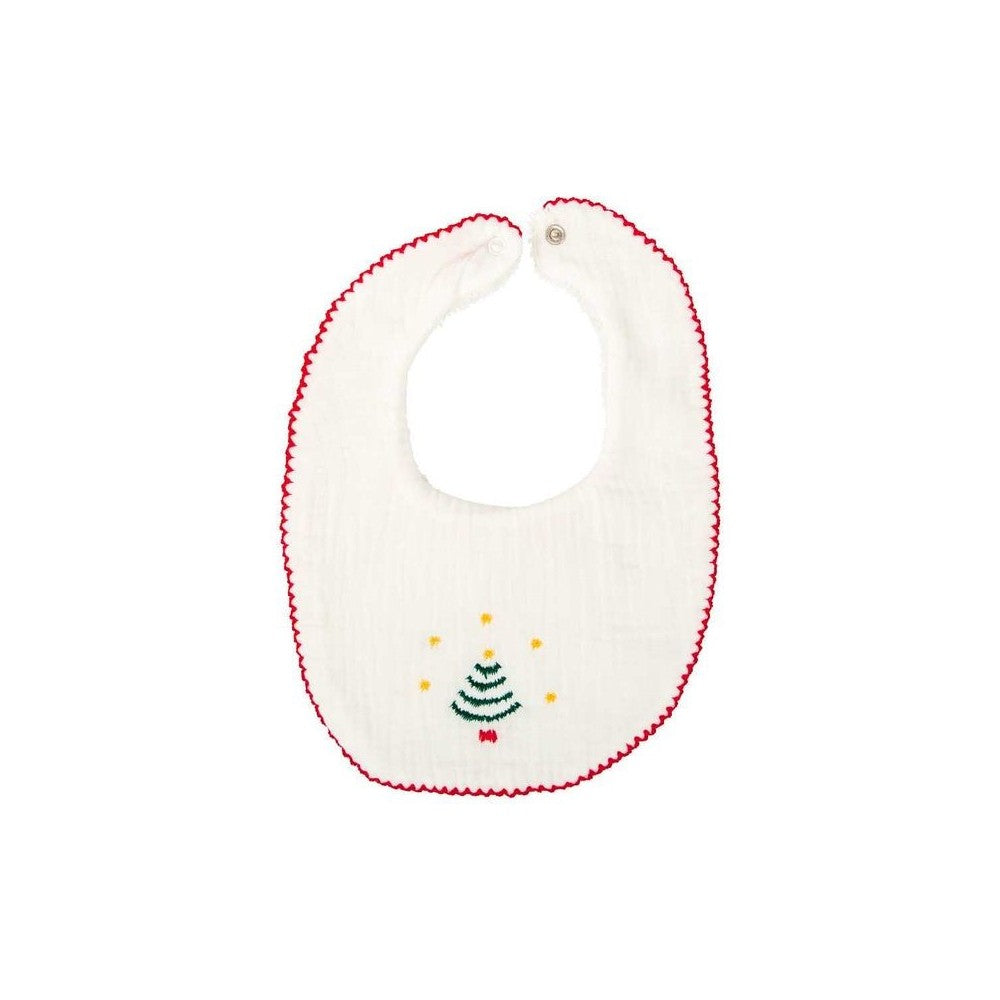 El complemento perfecto para las primeras navidades de tu bebé. Este babero está confeccionado en suave muselina blanca y decorado con un encantador bordado de árbol navideño rodeado de estrellitas doradas. Su ribete rojo ondulado le aporta un aire festivo y delicado, ideal para las comidas familiares en estas fechas tan especiales.