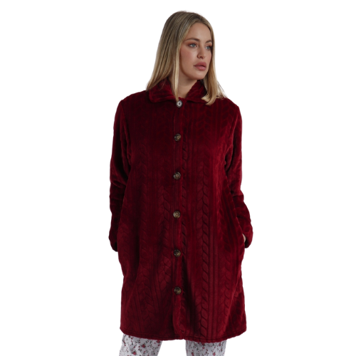 Bata de tejido especial jacquard Corel muy calentito. Cuenta con bolsillos y cierre con botones, ideal para estar cómoda y muy calentita en los días más fríos de invierno.