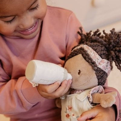 Conoce a la muñeca Evi en su suave canastilla de viaje. Evi lleva un adorable saco de dormir, un pelele y un pañal que se puede poner y quitar. Con su chupete y biberón, que se adhieren a su boca gracias a un imán, cuidarla es aún más divertido. La canastilla de tela acanalada con estampado floral y la manta a juego completan el conjunto. Perfecto para horas de abrazos y juegos de rol.
