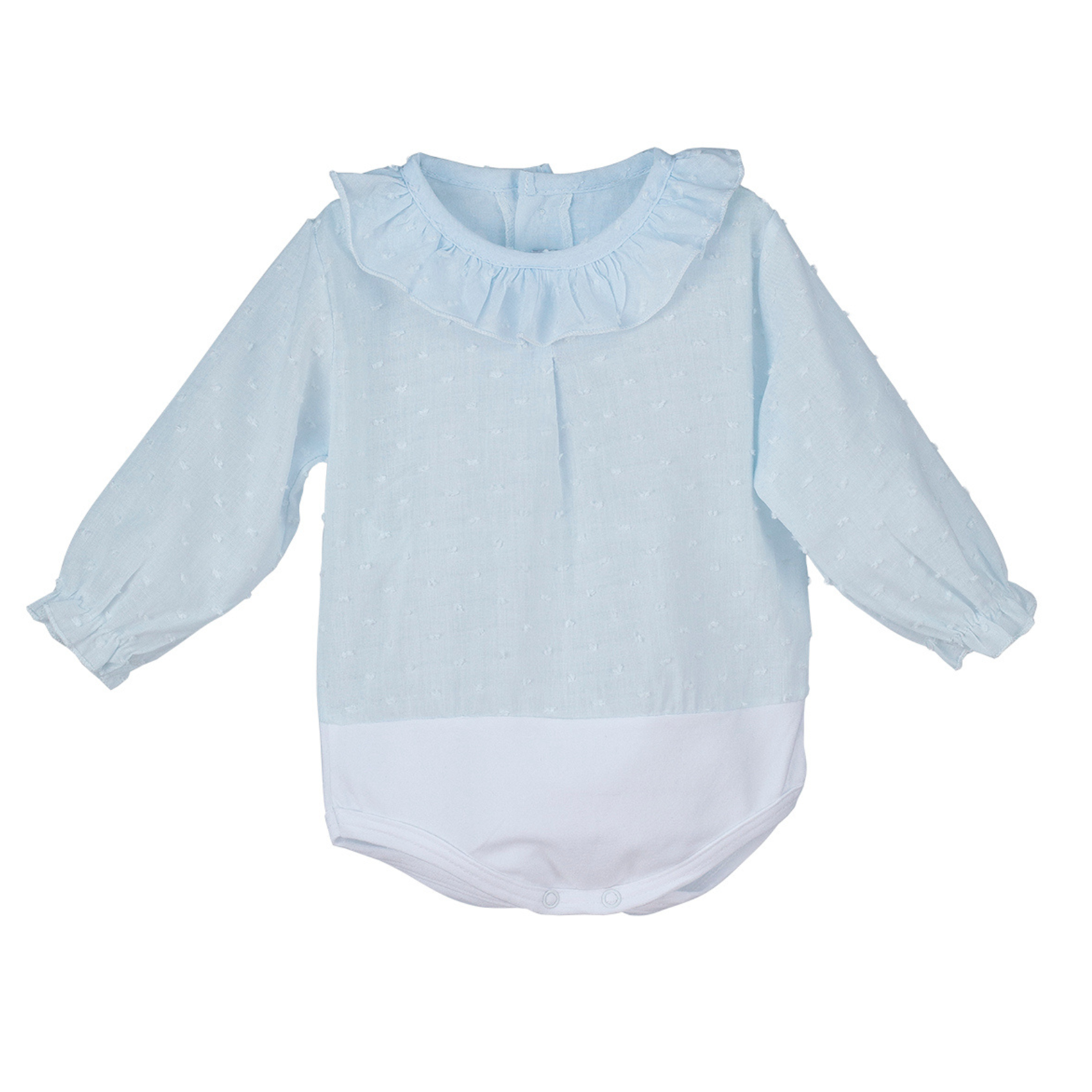 Camisa body de plumeti en color blanco, con volantito en cuello y manga larga con body incorporado.El complemento ideal para combinar con petos, pololos y ranitas de bebé.