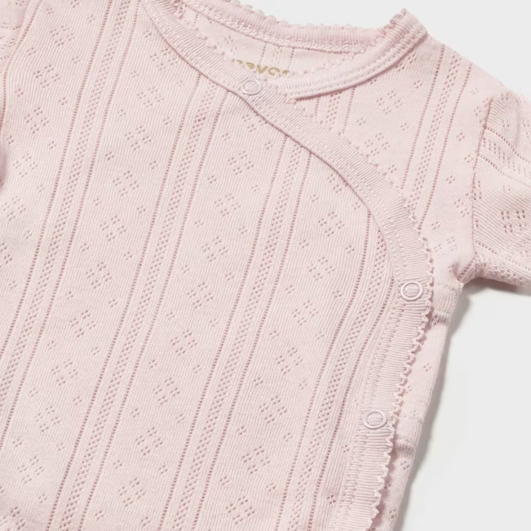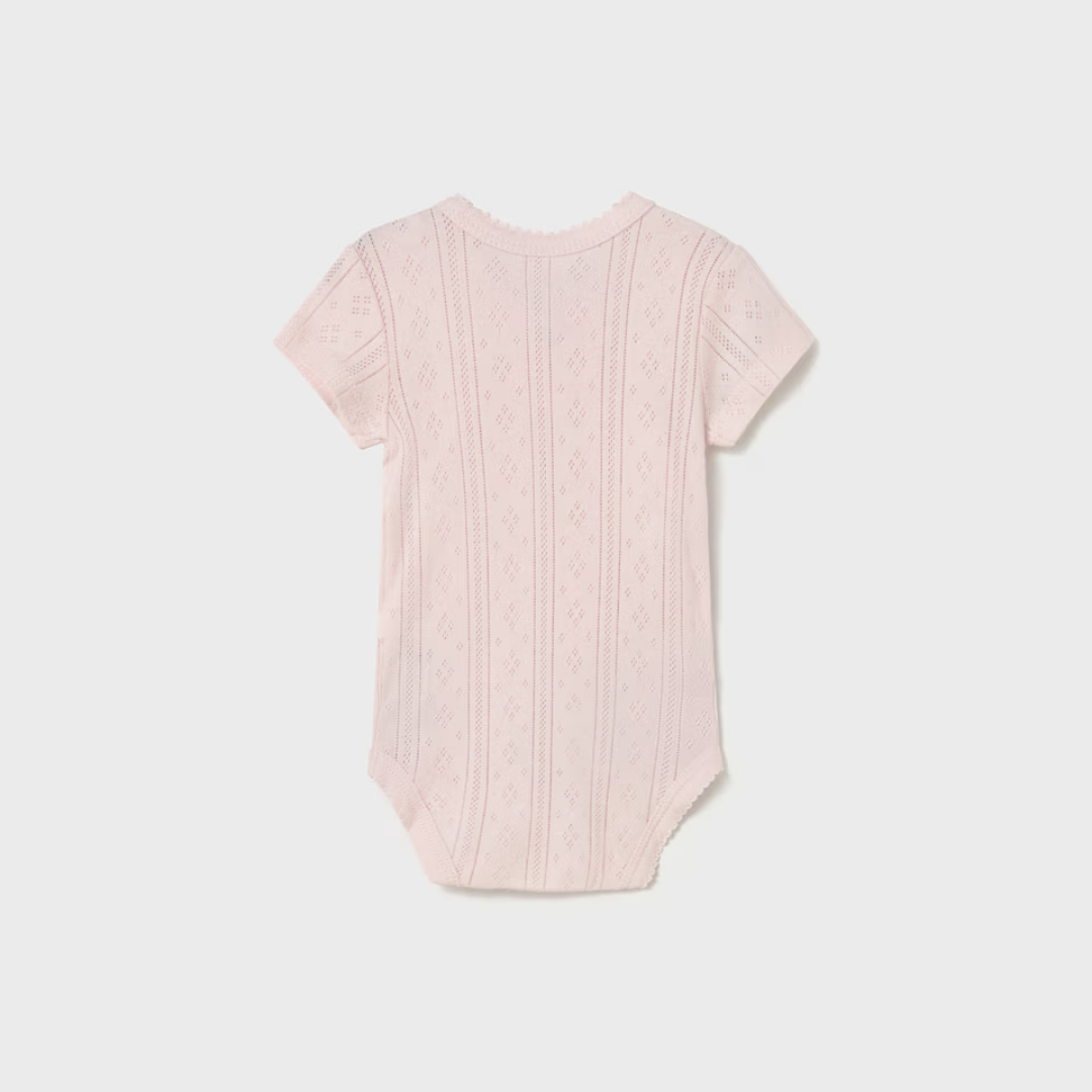 Una prenda básica y delicada para los primeros meses del bebé. Este body de manga corta de Mayoral destaca por su tejido calado en tono rosa suave, que aporta un estilo dulce y muy especial.