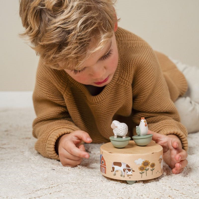 ¡Mira cómo giran la gallina y la oveja mientras suena la música! Esta caja de música de forma redonda está decorada con una alegre escena de la querida Pequeña Granja. Gíralo suavemente en la parte inferior y ponga en movimiento la danza mágica. Cuando la melodía comienza a sonar, la oveja y el pollo bailan con gracia al ritmo de las notas familiares de Old MacDonald Had a Farm . Un maravilloso regalo que hará sonreír a tu pequeño tan pronto como comience el viaje musical de la Pequeña Granja.