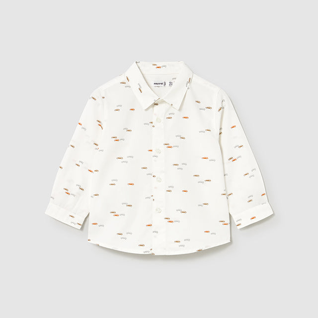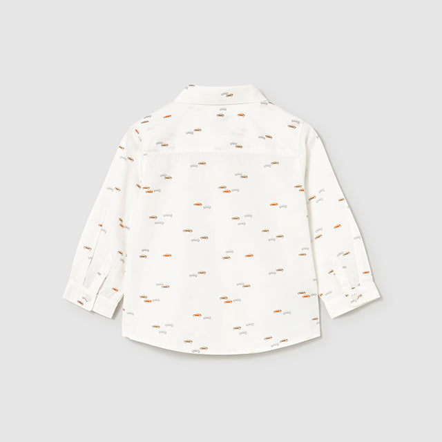 Camisa de manga larga para bebé con puños abotonados. Cuello camisero. Cierre con botones en la parte delantera. Diseño estampado de coches.