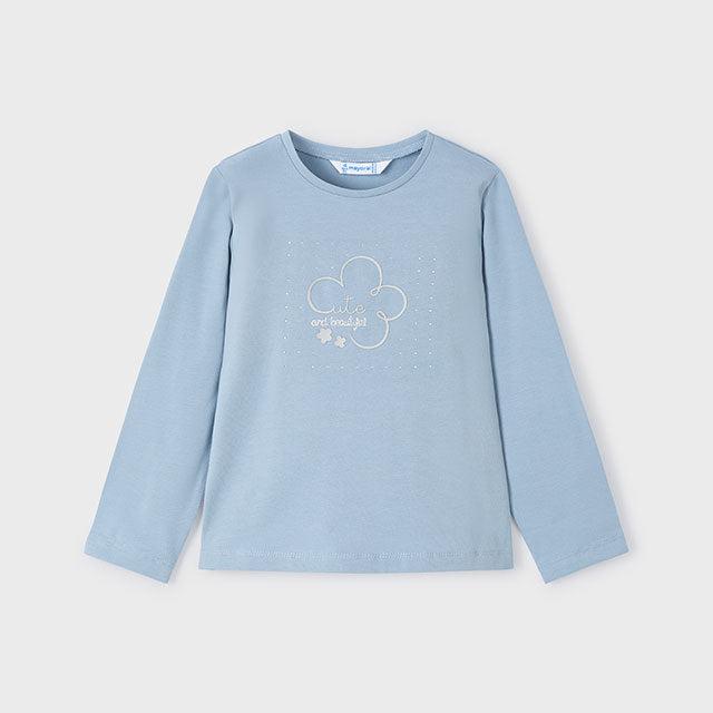 Camiseta básica de niña en varios colores con dibujo de flor. Es de manga y tiene adornos de glitter y strass.