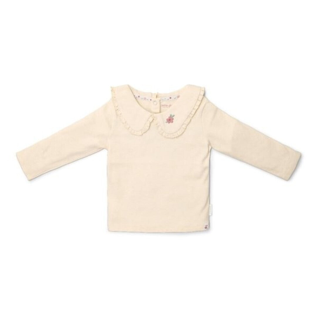 Cómoda camisa con cuello, color arena melange, bordado de flores, confeccionada en algodón orgánico, certificado Oekotex.