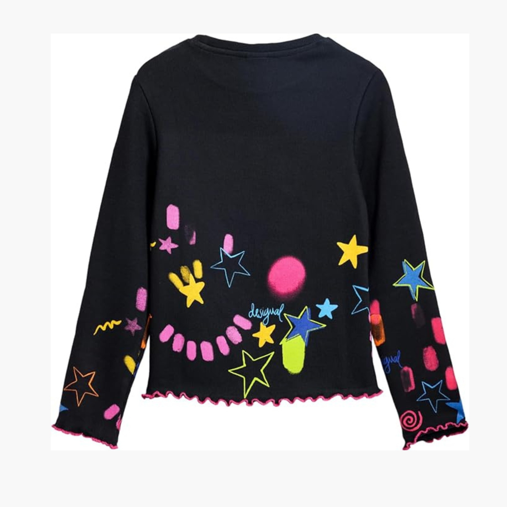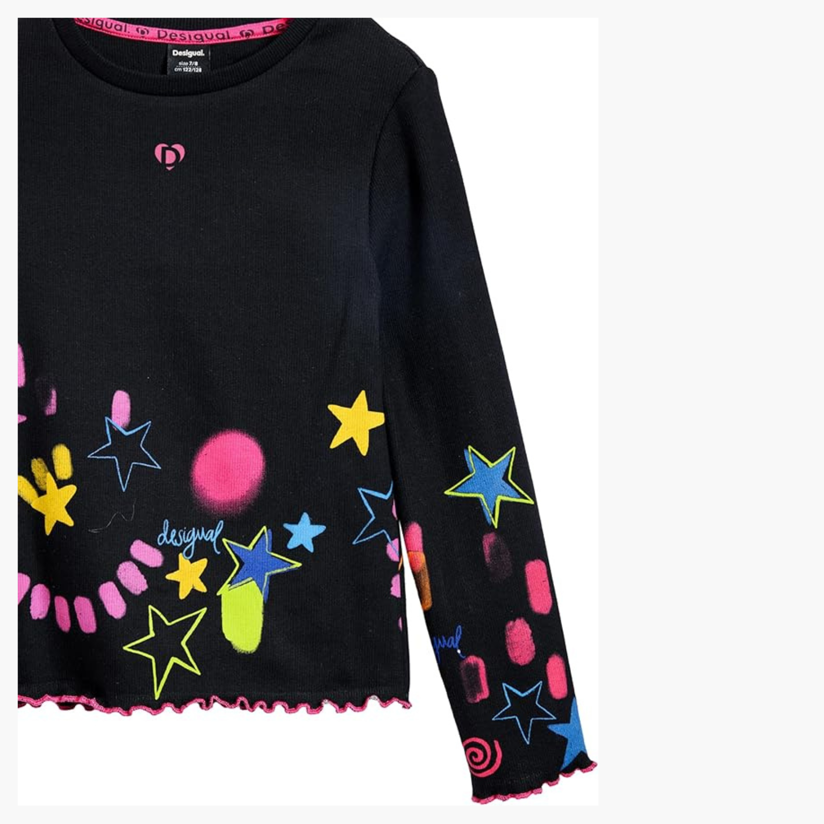 Camiseta de manga larga y cuello redondo, en algodón, en color negro y con detalles neón.