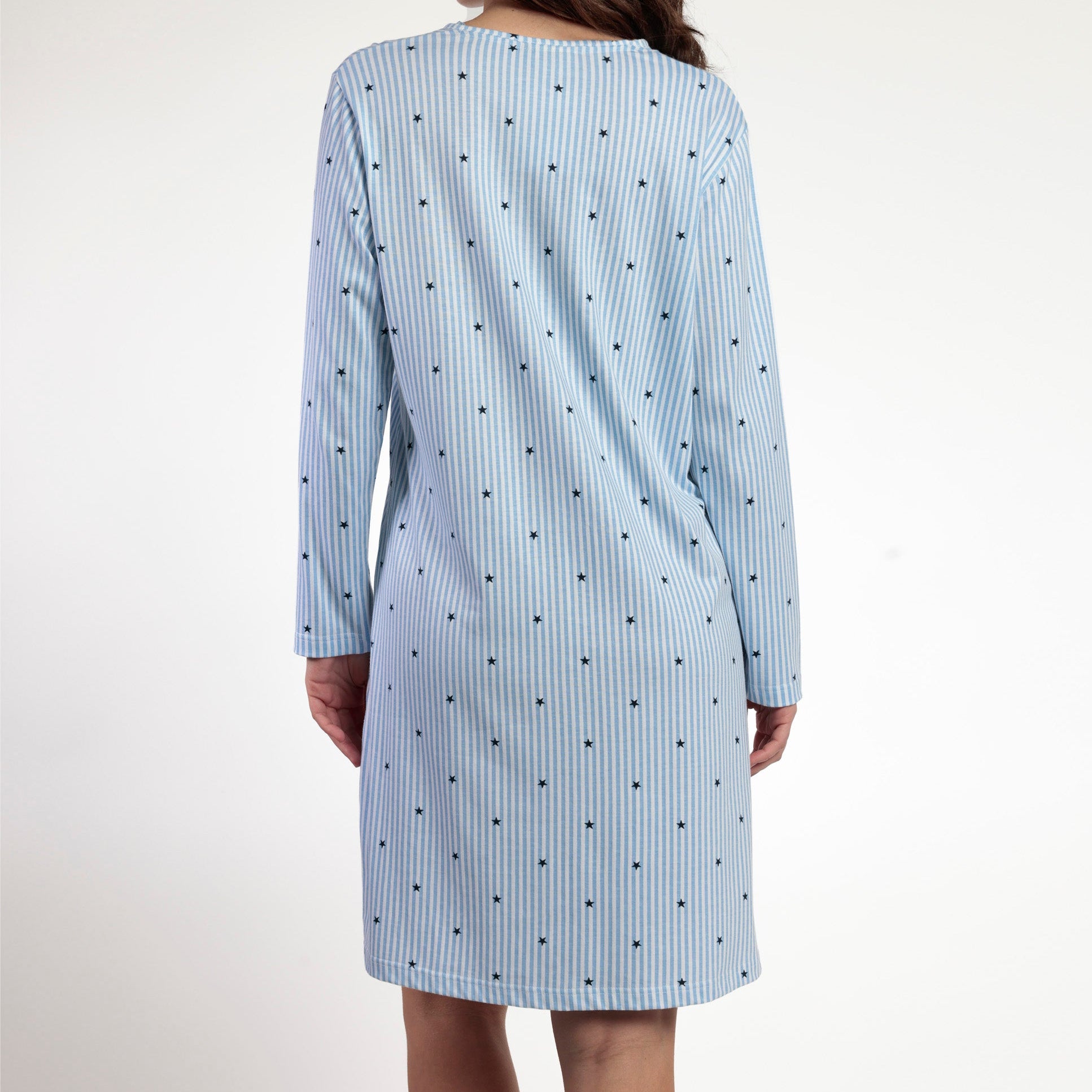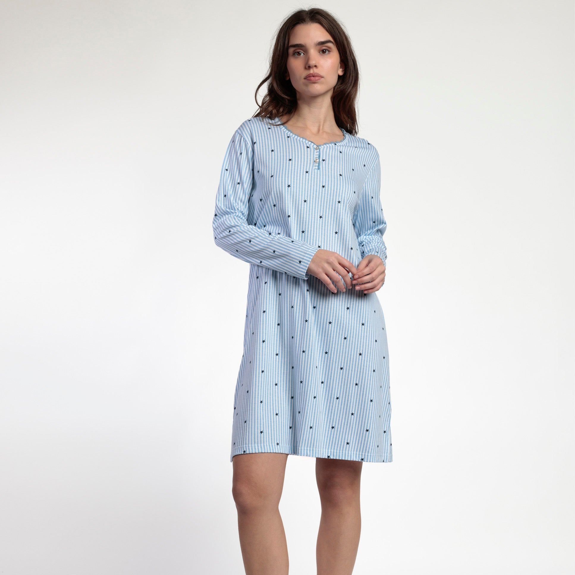 Camisola Stripes and Stars beige con manga larga y cuello con tapeta de botones y confeccionada en tejido suave y delicado que proporciona máximo confort durante todo el día. Presenta detalles de puntilla lencera que añaden elegancia y feminidad a la prenda. Una pieza versátil y sofisticada para el descanso y el hogar.