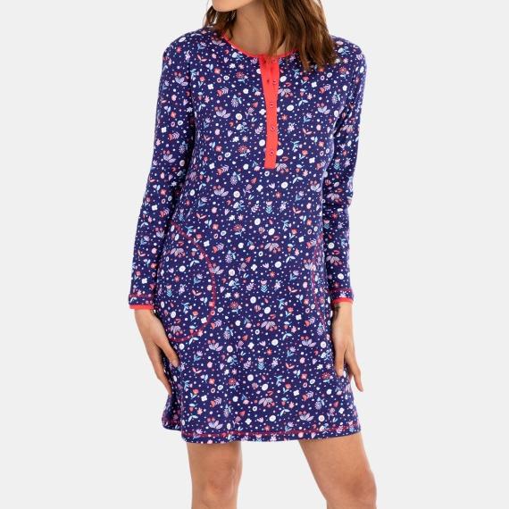 Camisón de punto 100% algodón, de manga larga con estampado fantasía posicionado en el lateral. Cuello e interior tapeta con estampado a contraste, y tapeta y botones a tono.