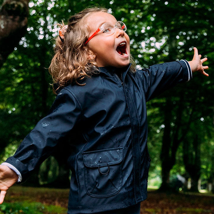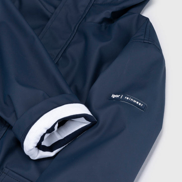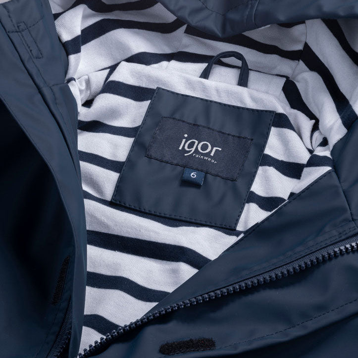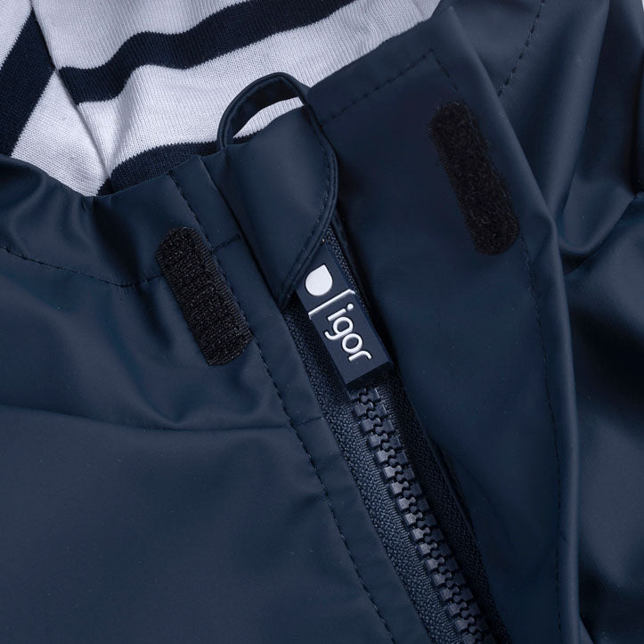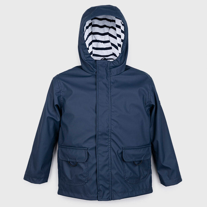 Chubasquero clásico impermeable con bolsillos frontales, solapa y forro interior de algodón a rayas.