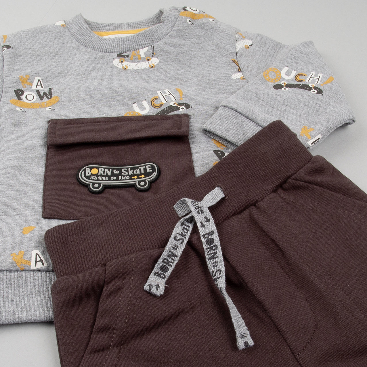 Conjunto de dos piezas de sudadera gris con con bolsillo y pantalón marrón.