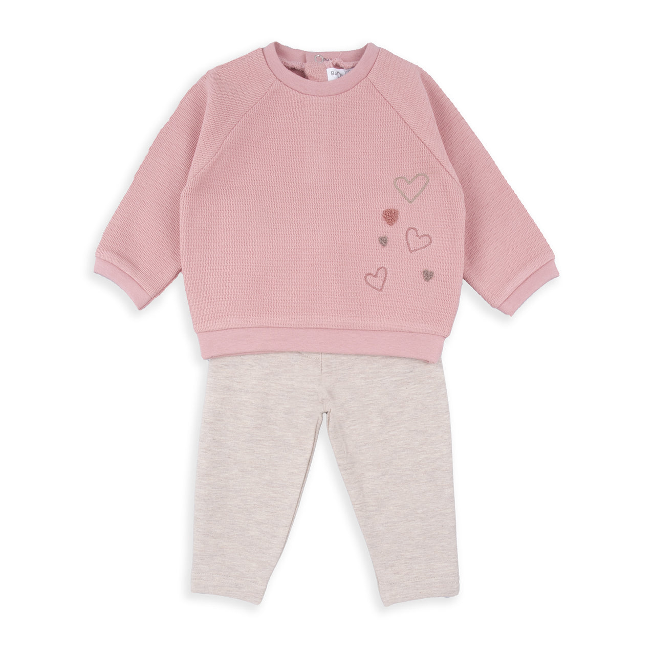 Conjunto de dos piezas de sudadera rosa con detalles de corazones y pantalón en tono beige.