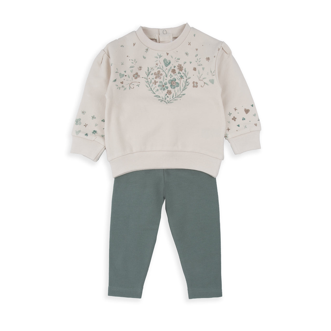 Conjunto de dos piezas de sudadera beige con corazones verdes y dorados con pantalón verde agua.