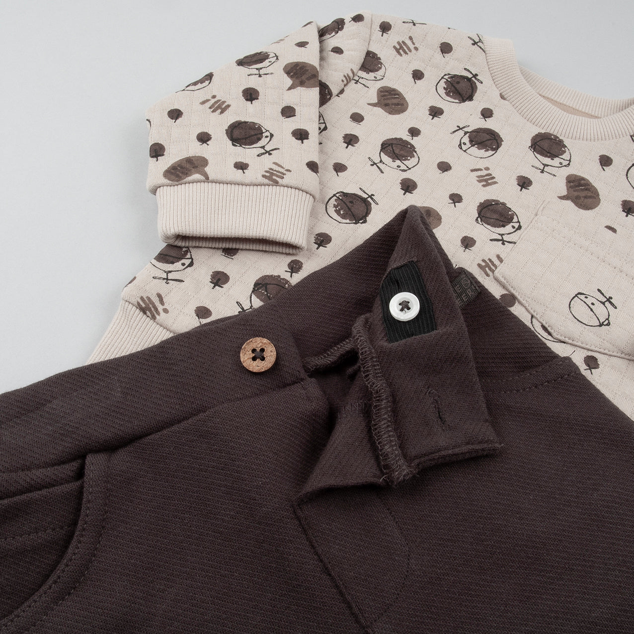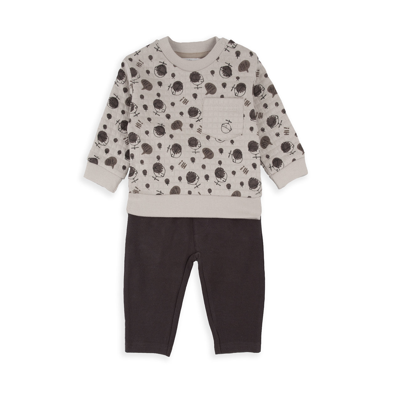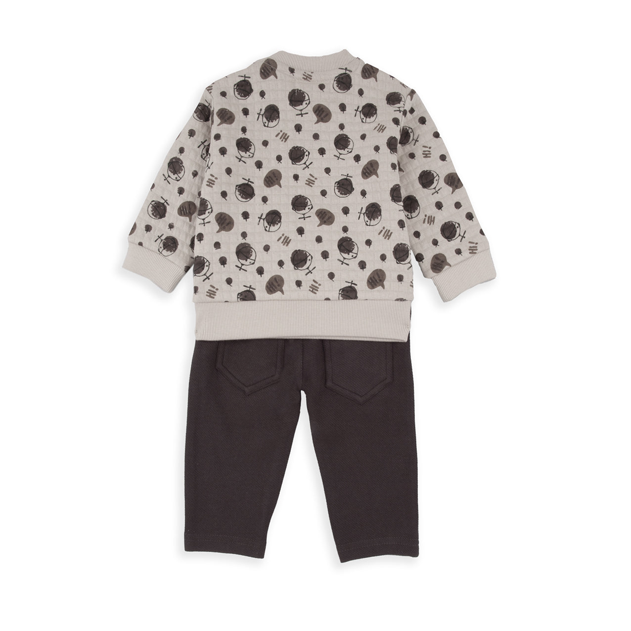 Conjunto de dos piezas de sudadera gris con dibujos y pantalón marrón.