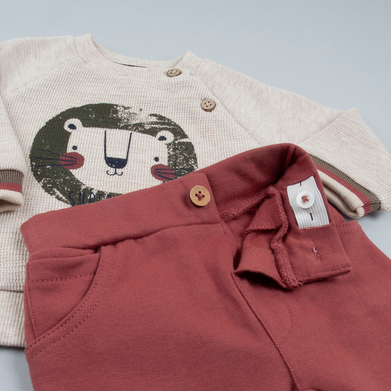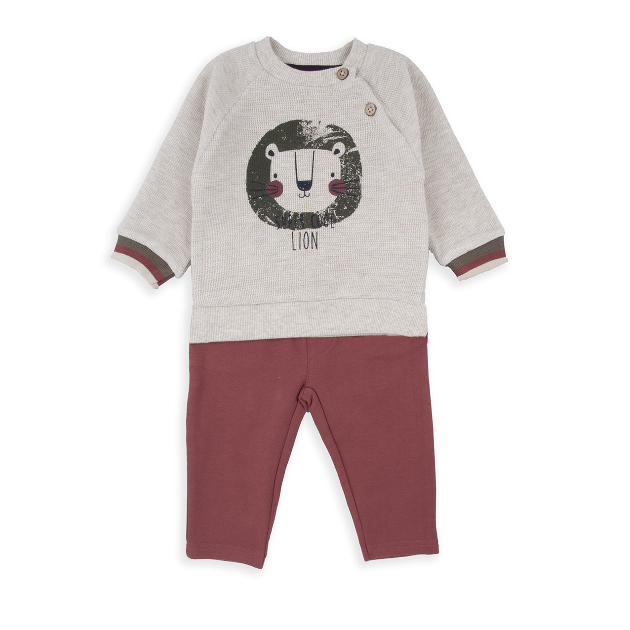 Conjunto de dos piezas de sudadera gris con diseño de león y pantalón en color vino tipo chino.