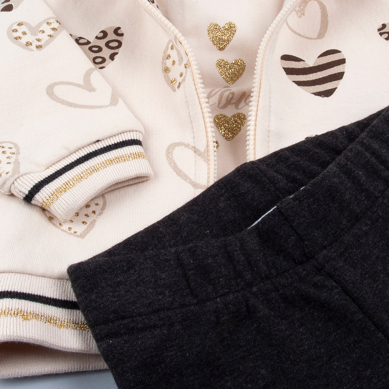 Conjunto de tres piezas de chaqueta beige con corazones beige, dorados y marrones con pantalón antracita.