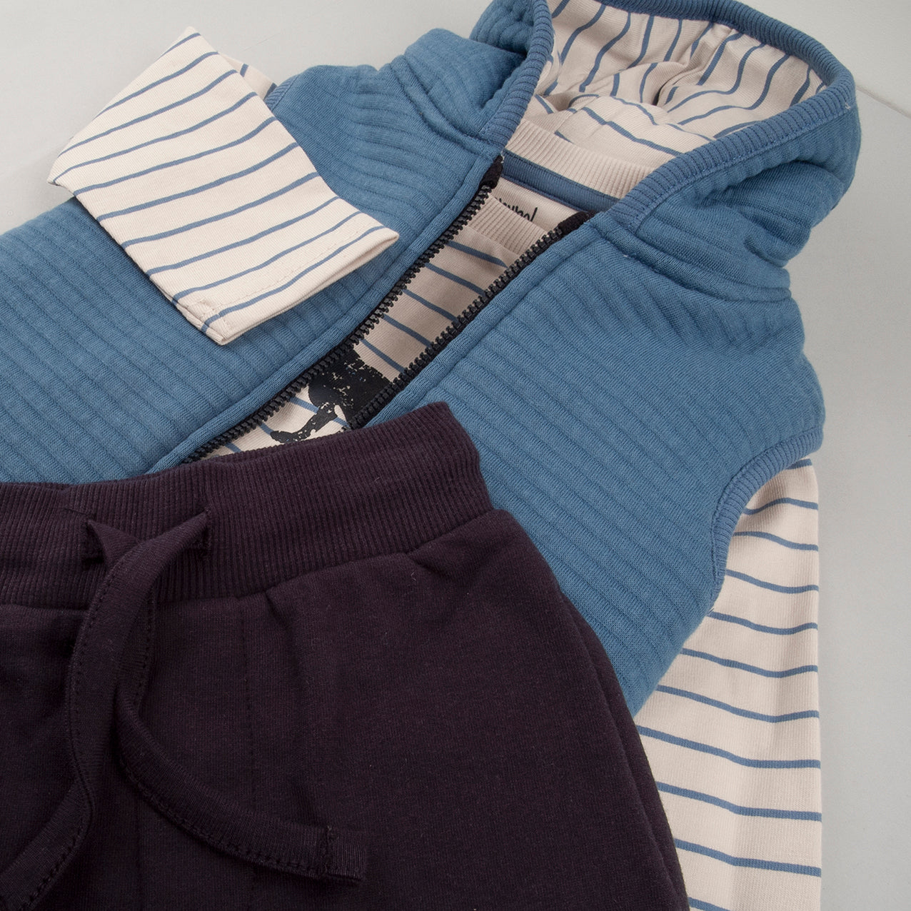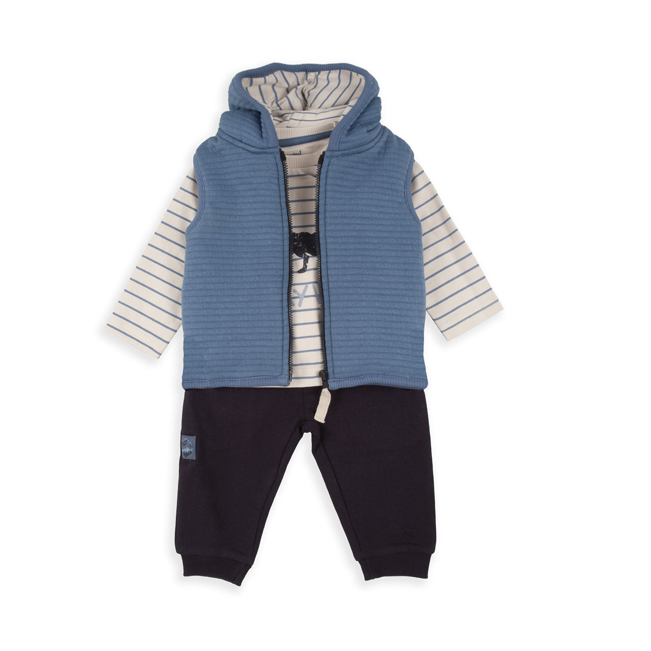 Conjunto de tres piezas de chaleco azul, camiseta a rayas con dibujo y pantalón antracita.