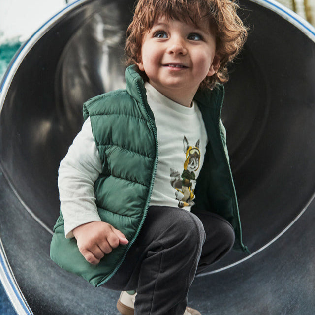Original conjunto de tres piezas para bebé. Chaleco para bebé. Cierre central delantero con cremallera. Exterior textil con efecto acolchado. Modelo con forro interior. Bolsillos funcionales en la parte delantera.