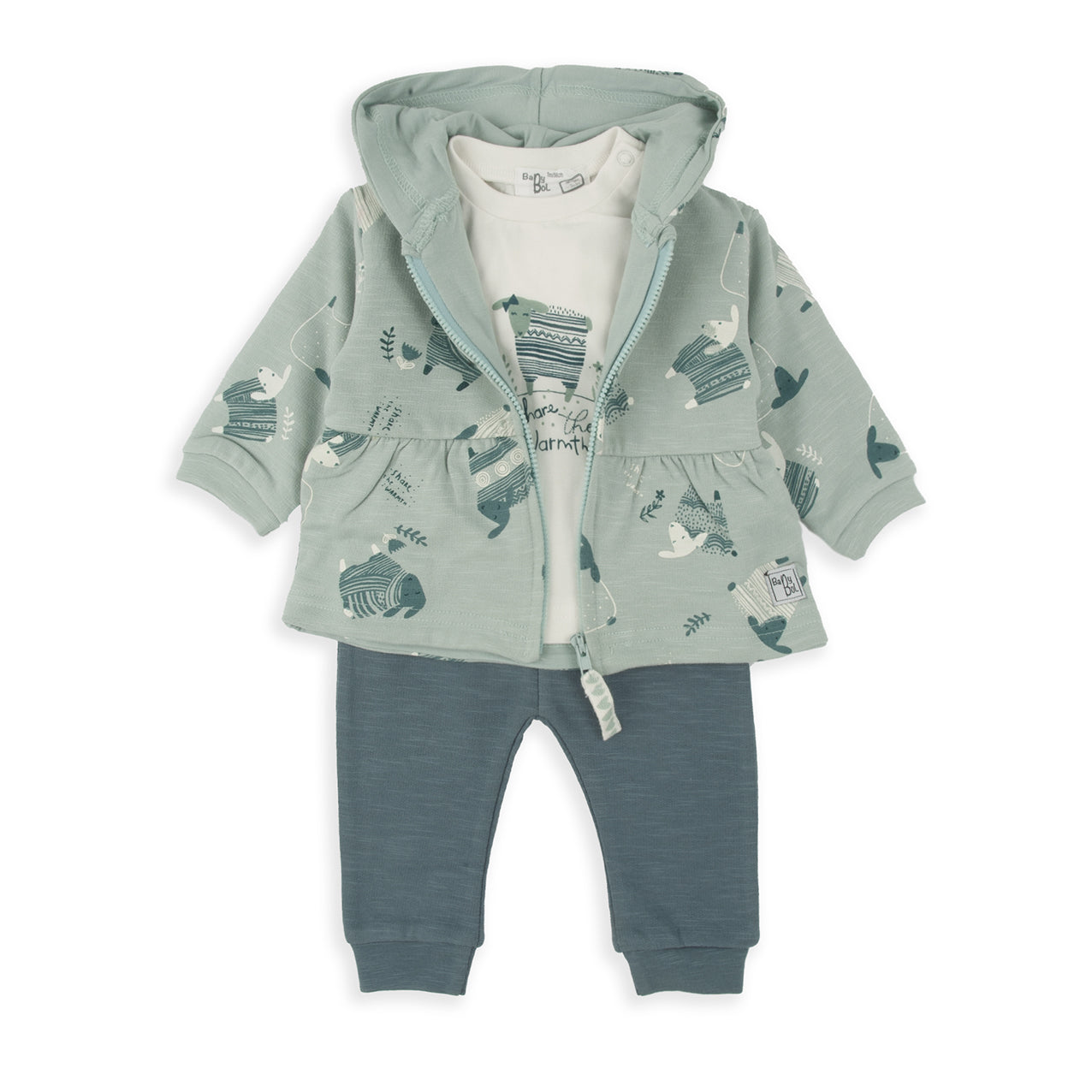Conjunto de chandal de tres piezas chaquetita, camiseta y oantalón en color verde agua.