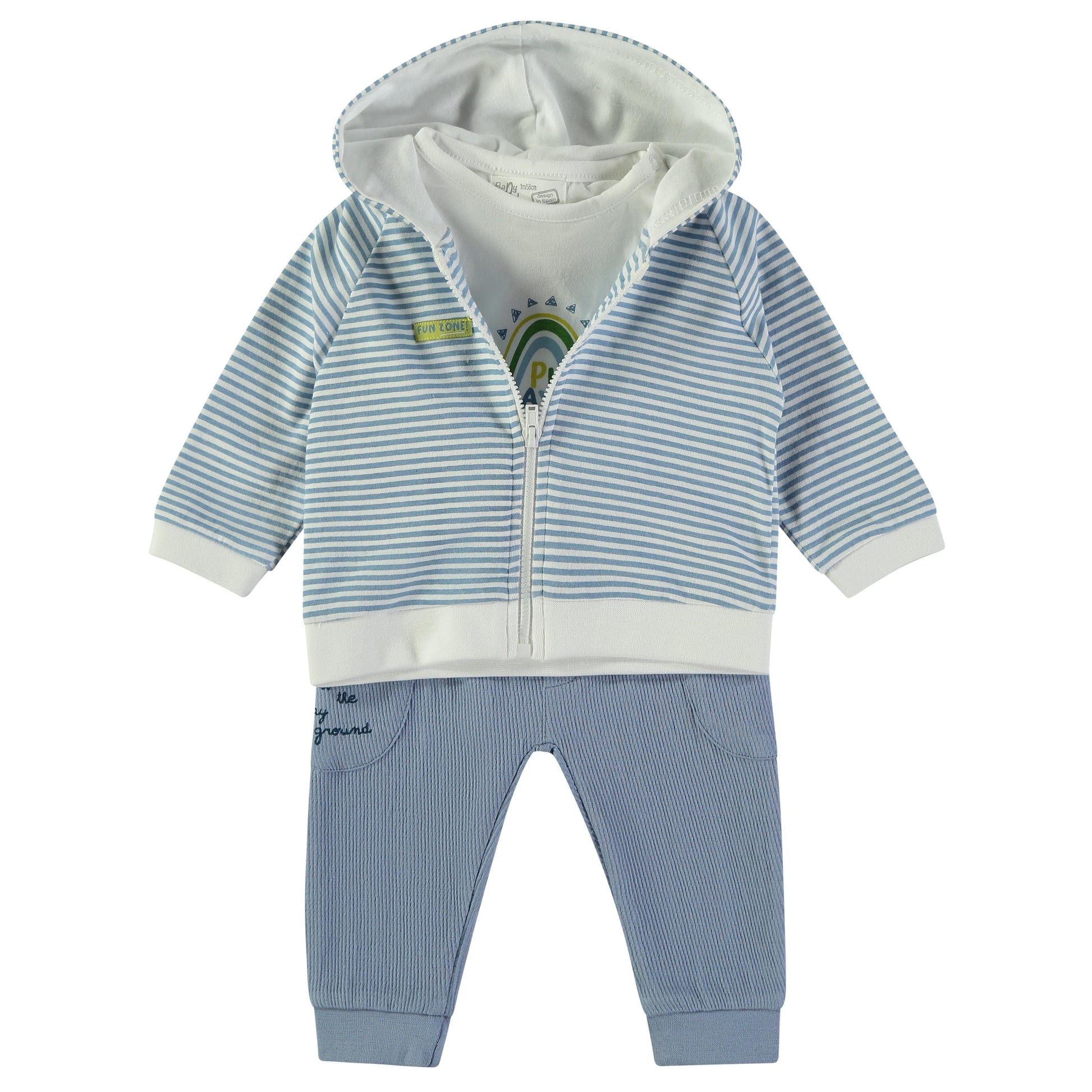 Este conjunto de tres piezas combina una sudadera con capucha de rayas, camiseta interior y pantalón en tono azul, creando un look completo, cómodo y moderno para el bebé.
