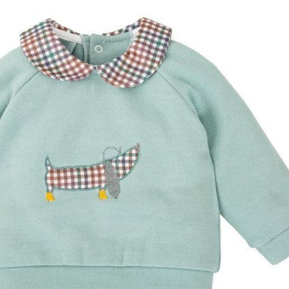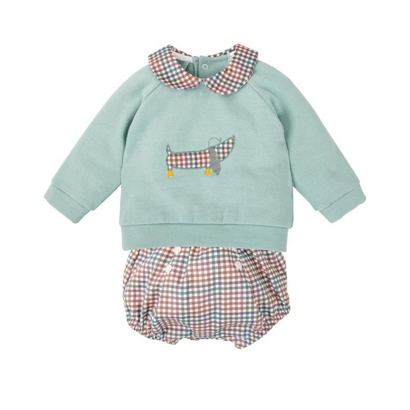 El conjunto de dos piezas Floresta Mochi está compuesto por una sudadera verde agua con cuello bebé y un simpático perrito bordado en el pecho, combinado con bombacho de cuadros en tonos tierra, granate y azul. Ideal para un look cálido y lleno de estilo. El cuello y el interior de los puños van a juego con el bombacho para un acabado coordinado y encantador.
