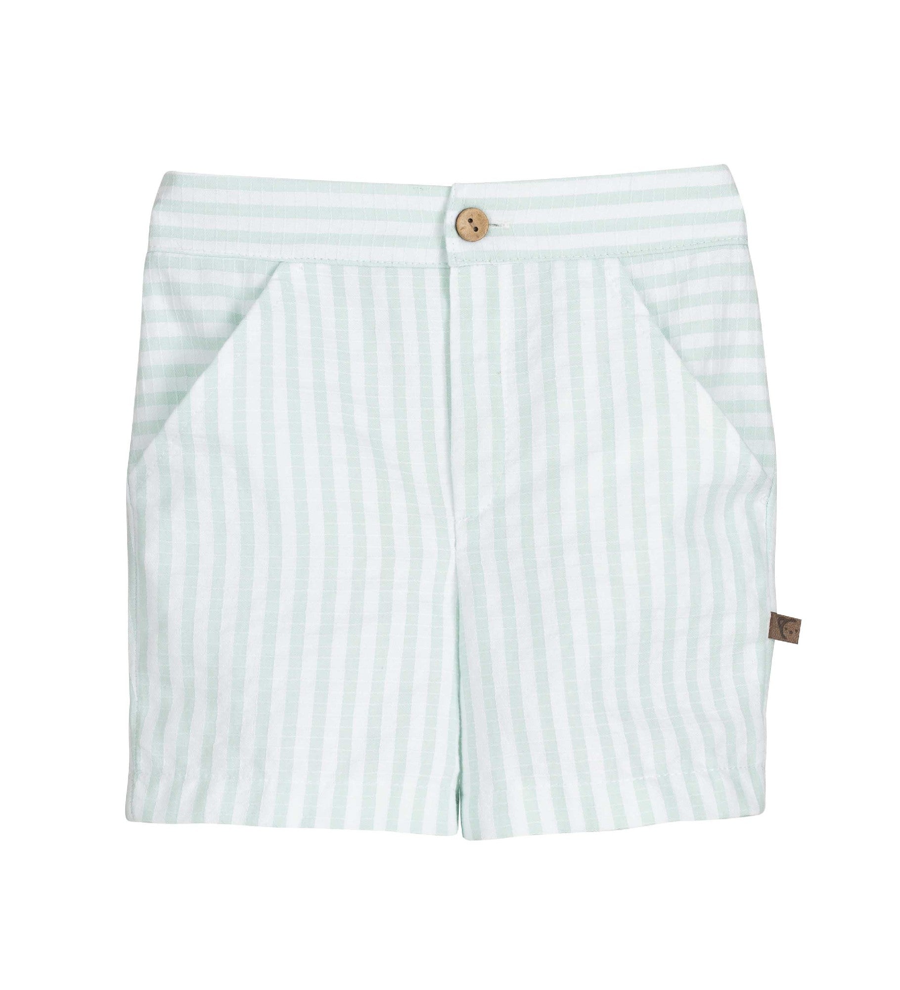 La camiseta presenta cuello clásico y botones de madera que aportan un toque natural y delicado. El pantalón corto, confeccionado en tejido ligero con rayas mint, completa el conjunto con un estilo fresco y cómodo para el bebé.