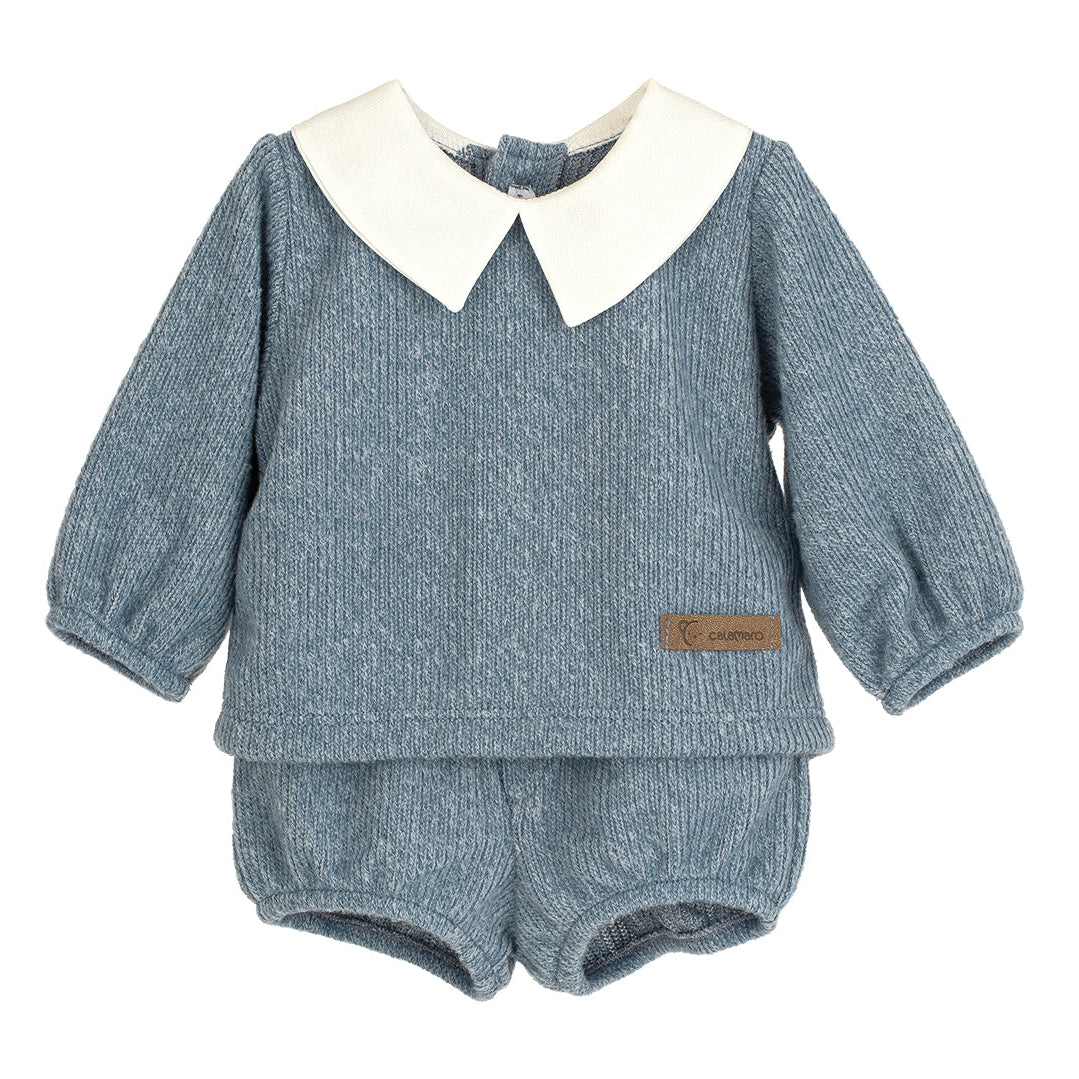 Conjunto de Jersey y Pololo con jersey con cuellito de pico en blanco y pololo en azul.