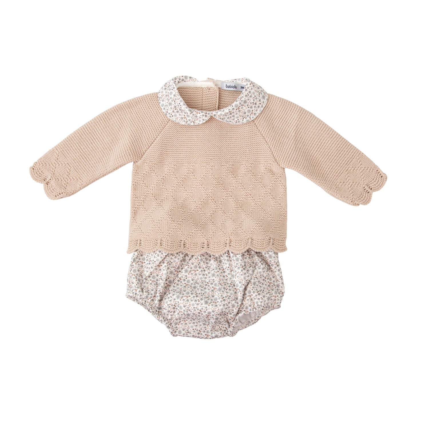 El tierno conjunto Escarcha para bebé compuesto por un jersey de punto beige con calado decorativo y cuello de volante en tejido estampado floral, acompañado de un cubrepañal a juego. Una combinación cómoda, coqueta y perfecta para los meses más fresquitos.