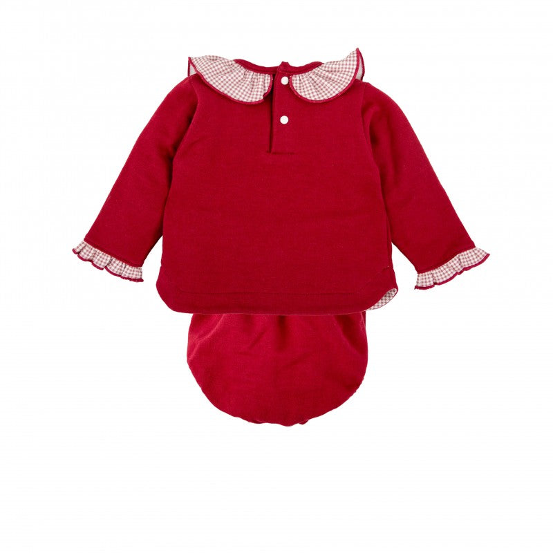 El conjunto Nevada de felpa en tono burdeos es una opción encantadora para los primeros meses del bebé. La parte superior luce un diseño dulce y femenino, con cuello redondeado en cuadros vichy rojo y delicado volante a contraste. Las mangas se rematan con puños fruncidos y el clásico ribete ondulado.