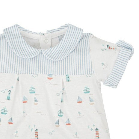 La camiseta presenta un delicado estampado marinero con barquitos, faros y pequeños detalles náuticos en tonos suaves, combinado con canesú y cuello redondo en rayas azul claro que aportan un estilo clásico y fresco. Las mangas cortas con vuelta en rayas coordinadas refuerzan ese aire veraniego y cuidado.