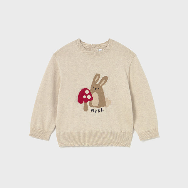 Jersey de manga larga para bebé. Cuello con ondas. Cierre con botones en la espalda para facilitar la puesta de la prenda. Confección combinada en distintos tejidos para conseguir un diseño único y especial. Elementos de adorno: bordados en la parte delantera.