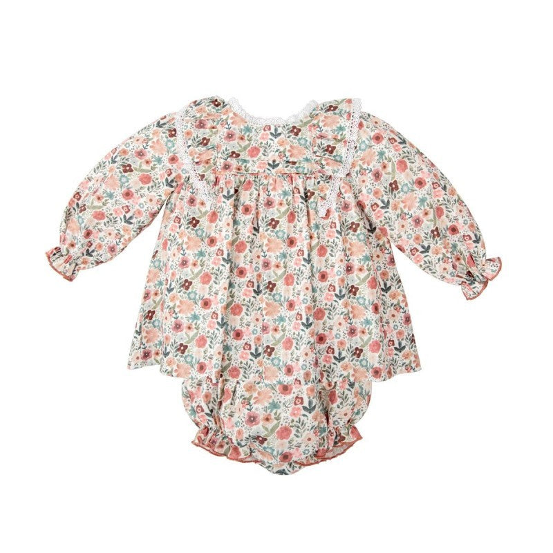 Este conjunto de blusa y braguita es una elección ideal para vestir a tu bebé con dulzura y estilo. Confeccionado en algodón suave y ligero, presenta un encantador estampado floral en tonos rosa, coral y verde sobre fondo blanco roto, que aporta frescura y romanticismo.
