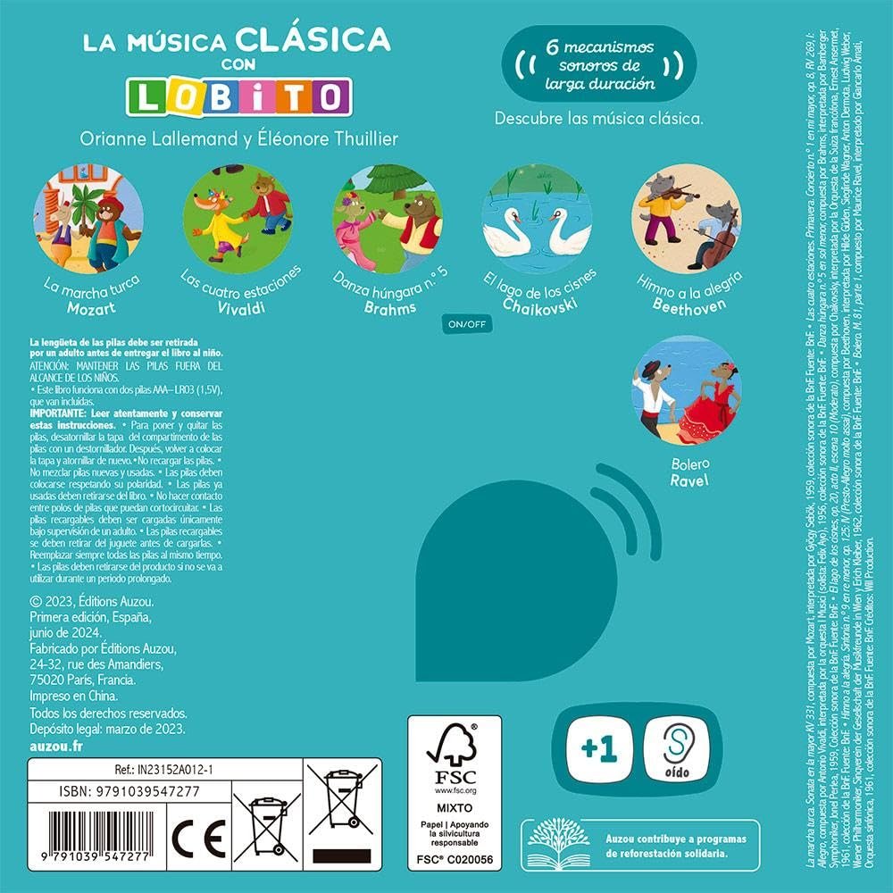 ¡Descubre la música clásica con Lobito! En este álbum sonoro, escuche 6 extractos de la música clásica más famosa: La Marcha Turca, Mozart Las Cuatro Estaciones, La Danza Húngara No. 5 de Vivaldi, El Lago de los Cisnes de Brahms, El Himno a la Alegría de Tchaikovsky, el Bolero de Beethoven, Ravel