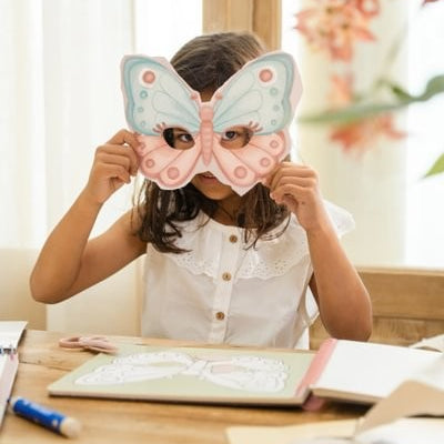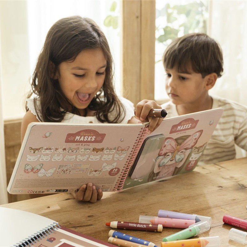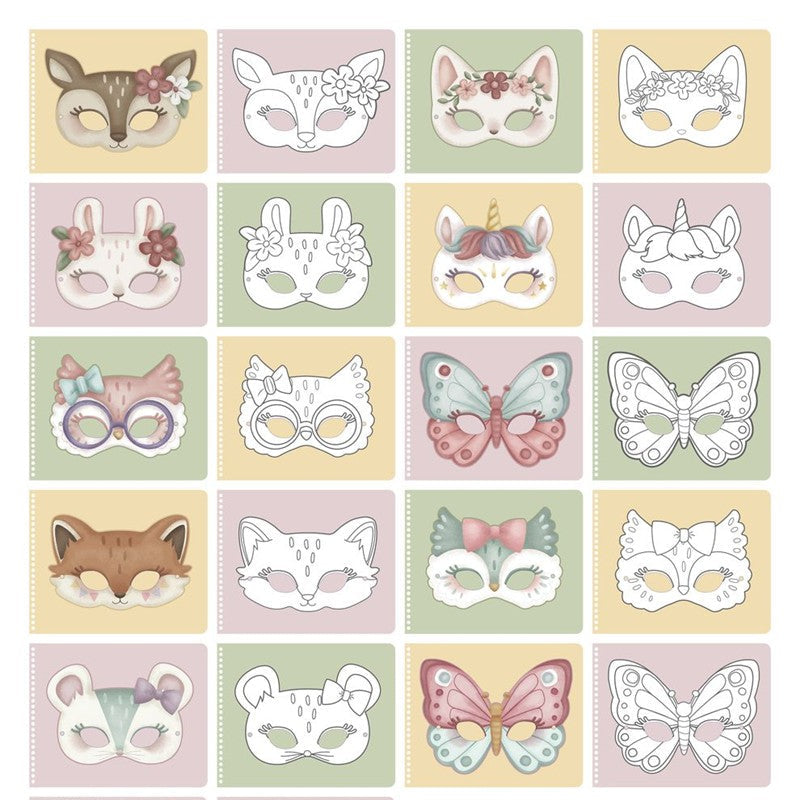 Libro con máscaras para pintar y recortar. Incluye tijeras, pegatinas y 20 hojas de máscaras.