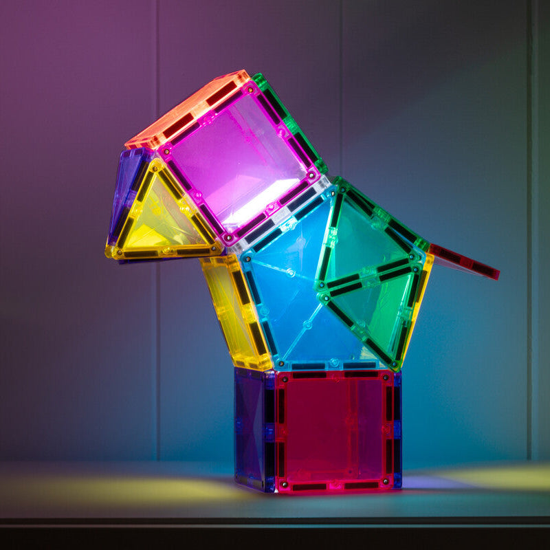 Con solo pulsar un botón, puedes alegrar tu juego desde cualquier ángulo. Simplemente ilumina un lado de la baldosa para ver cómo brilla la magia o crea algo completamente diferente iluminando ambos lados y observa cómo tu diseño cobra vida. Con el diseño único de bisel CONNETIX, los niños pueden experimentar con la intensidad y dirección de la luz para explorar conceptos divertidos de aprendizaje STEAM, desde la mezcla de colores hasta las refracciones, las sombras y las ilusiones ópticas.