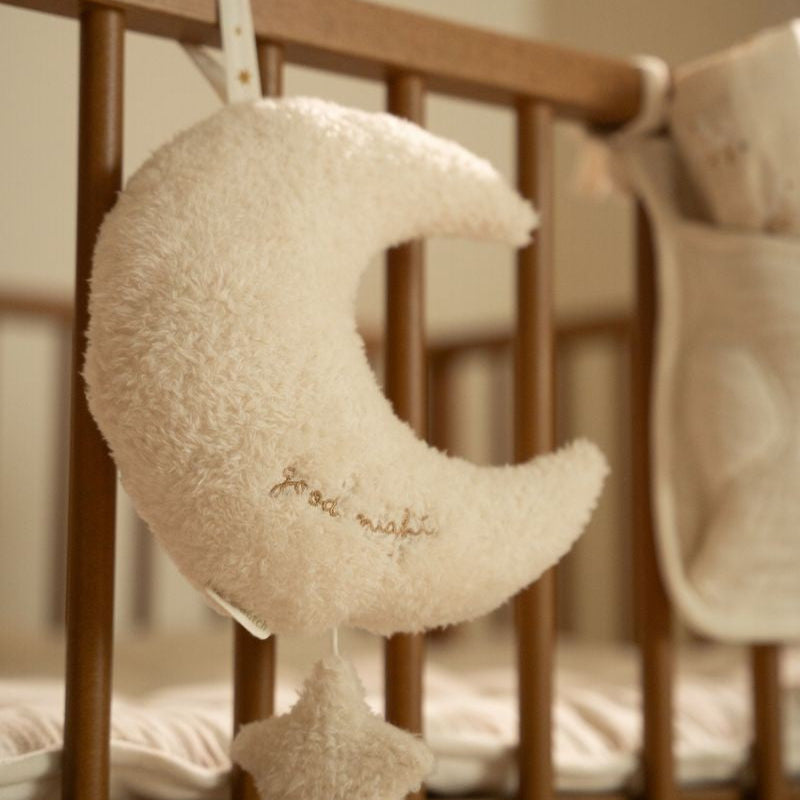 Deja que tu pequeño se duerma bajo la luz de la luna. Tira del cordón y la Caja de Música Newborn Naturals reproducirá una melodía relajante, perfecta para una hora de dormir tranquila. Su diseño acogedor, sus materiales suaves y su práctico sistema para colgar la convierten en un complemento encantador para la habitación del bebé. Una luna dulce cuida de tu pequeño, brindándole una sensación de seguridad. ¡Que duermas bien, pequeño!