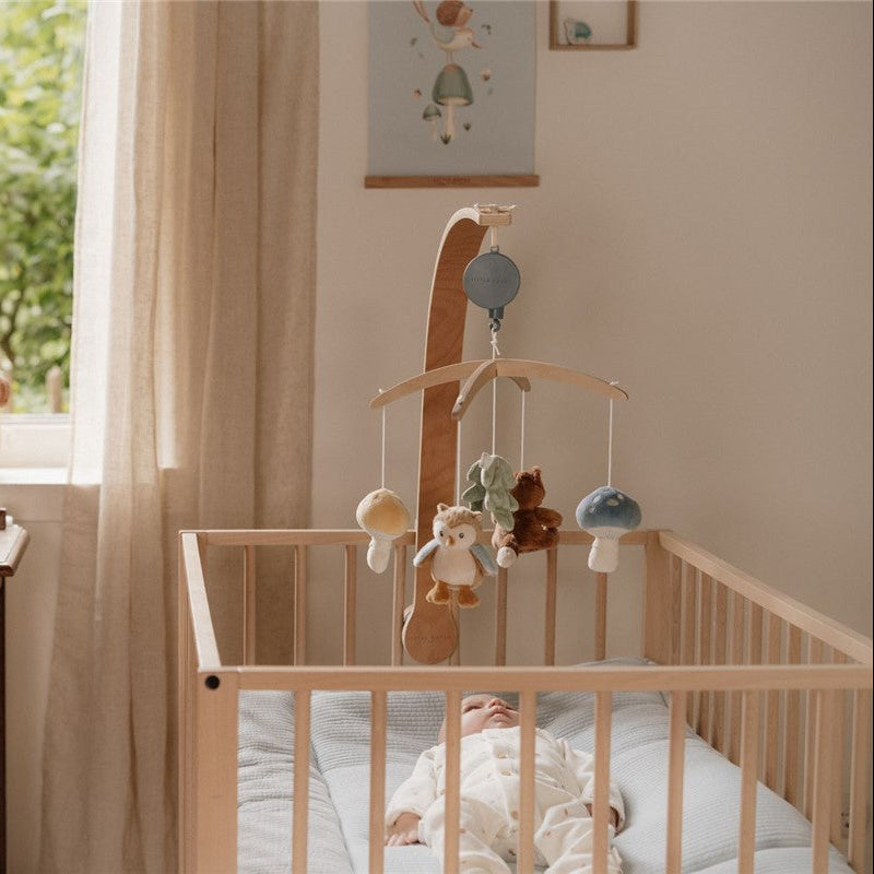 Sigue el sonido y observa cómo giran el pequeño zorro y el búho. Este simpático móvil musical de madera tiene un efecto relajante en los bebés gracias a la dulce canción de cuna. Cuenta con cinco juguetes colgantes diferentes para mirar de la colección Forest Friends: el zorro, el búho, dos setas y una hoja. Mientras tu pequeño disfruta del movimiento de cada juguete, el móvil musical estimula el desarrollo visual. El móvil musical es adecuado desde el nacimiento y es fácil de colocar en la cuna o el parque infantil.