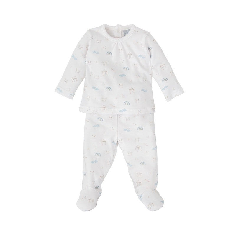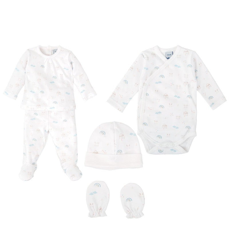 Este set cielo de primera puesta es perfecto para dar la bienvenida al recién nacido con suavidad, comodidad y estilo. Confeccionado en algodón 100% de alta calidad, cada prenda presenta un dulce estampado en tonos pastel con arcoíris, nubes, ositos y casitas, aportando un aire tierno, neutro y armonioso.