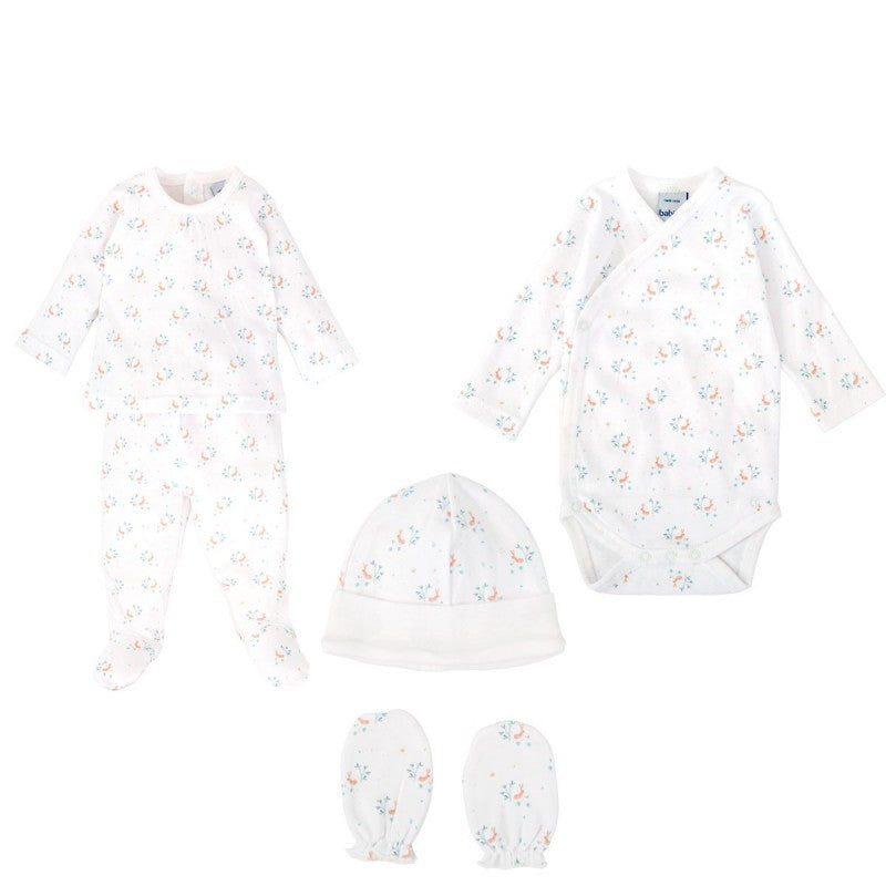 Incluye todas las prendas esenciales para los primeros días del bebé: camiseta cruzada con apertura trasera, polaina con pies integrados, body cruzado con cierre lateral, gorrito con vuelta y manoplas protectoras. Un conjunto práctico, funcional y estéticamente armonioso, perfecto como regalo o para preparar la canastilla.