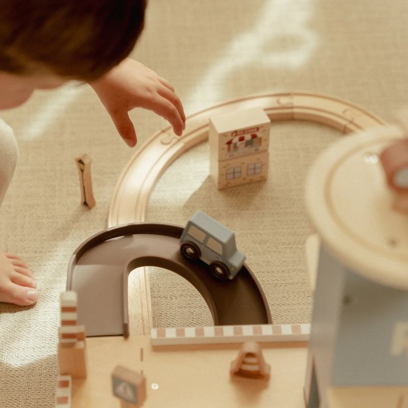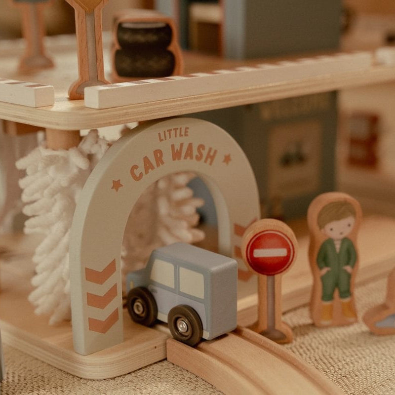 ¡Aparca, recarga combustible y corre! Este garaje de juguete de madera es el complemento perfecto para el Set de Tren Little Dutch XL. El garaje cuenta con una planta baja con lavadero de autos, dos plataformas de estacionamiento y una estación de carga eléctrica, además de una plataforma para helicópteros en la parte superior. Incluye accesorios de madera como señales de tráfico, neumáticos apilados y un cubo. También incluye tres vehículos y un helicóptero. Conduce, aparca tu auto o vuela a tu destino. ¡Diversión sin límites garantizada!