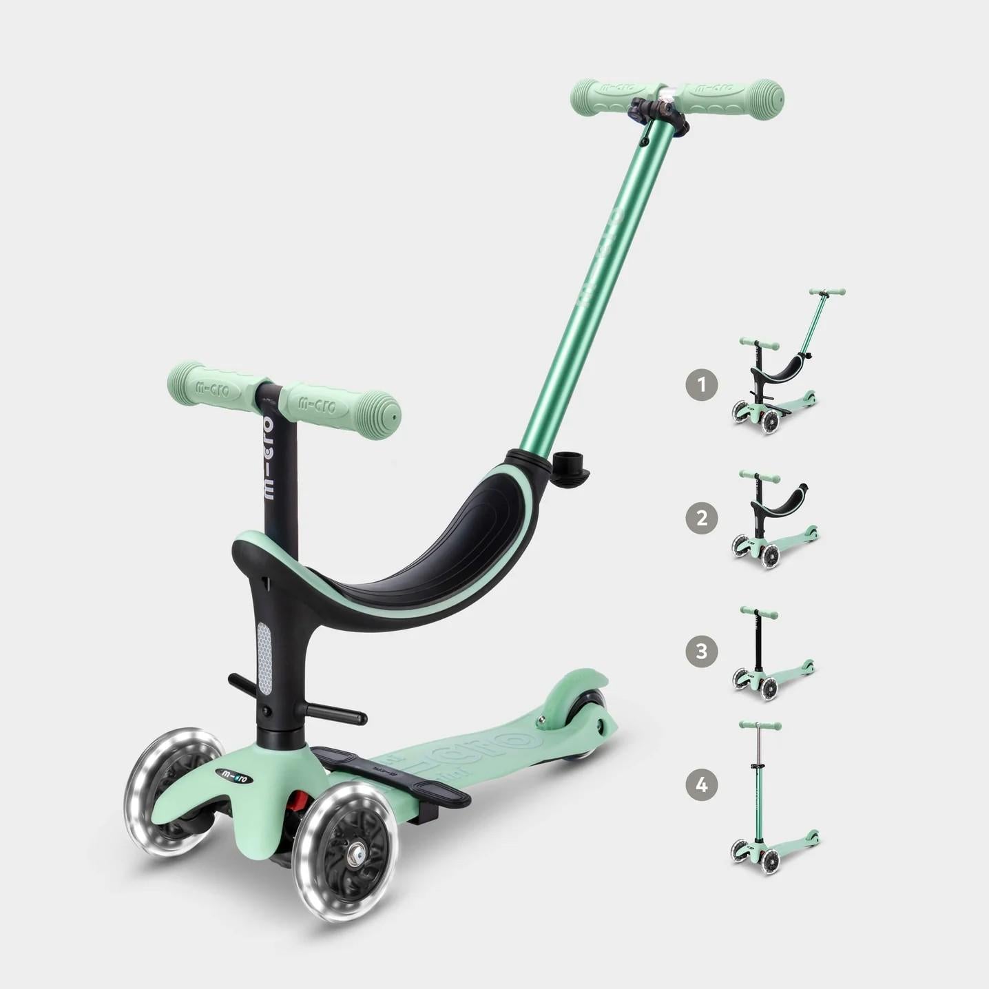 El innovador y ergonómico patinete todo en uno se puede utilizar en diferentes variantes: al principio con asiento, dos opciones de reposapiés y barra de empuje para los padres, posteriormente sin barra de empuje, como una mezcla entre bicicleta de equilibrio y patinete y finalmente como un Mini Micro Deluxe con luces LED en sus ruedas.