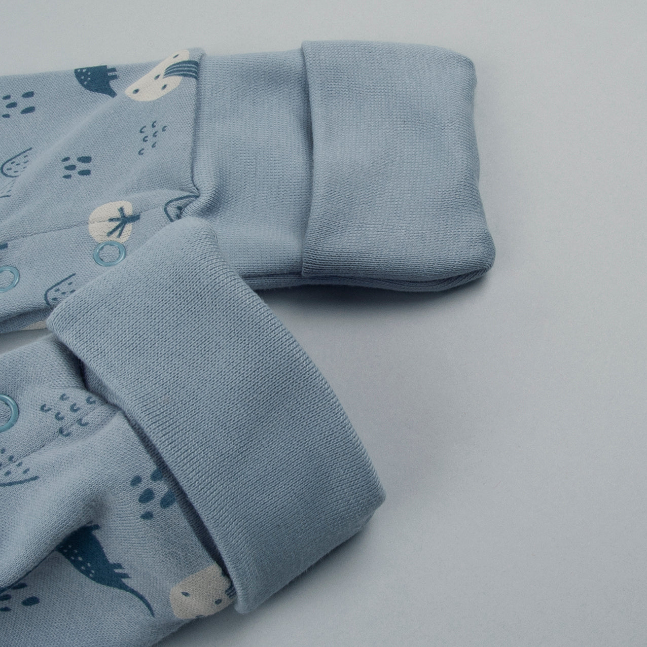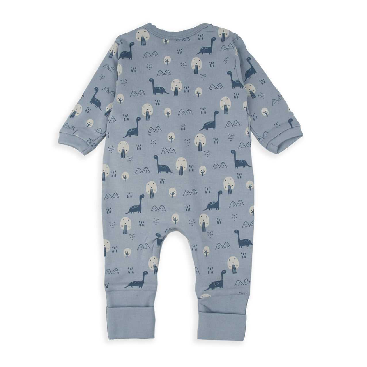 Pelele azul con motivos de dinosaurio. Los pies viene con patente que se puede cerrar para tener los pies calentitos.