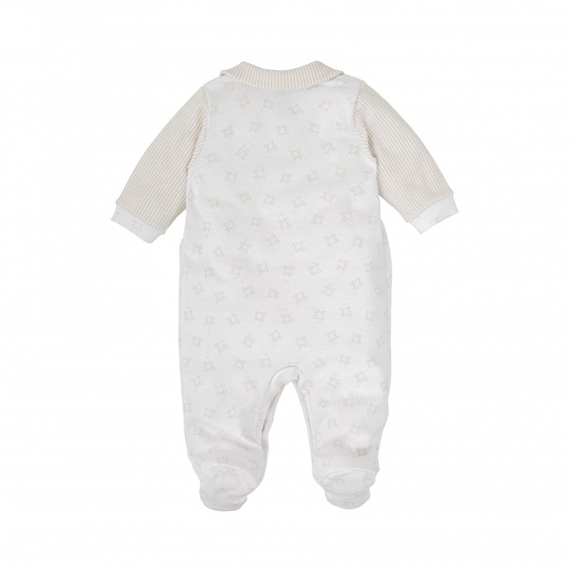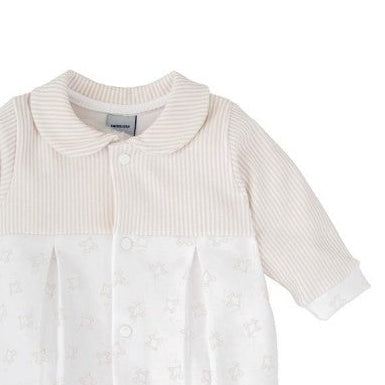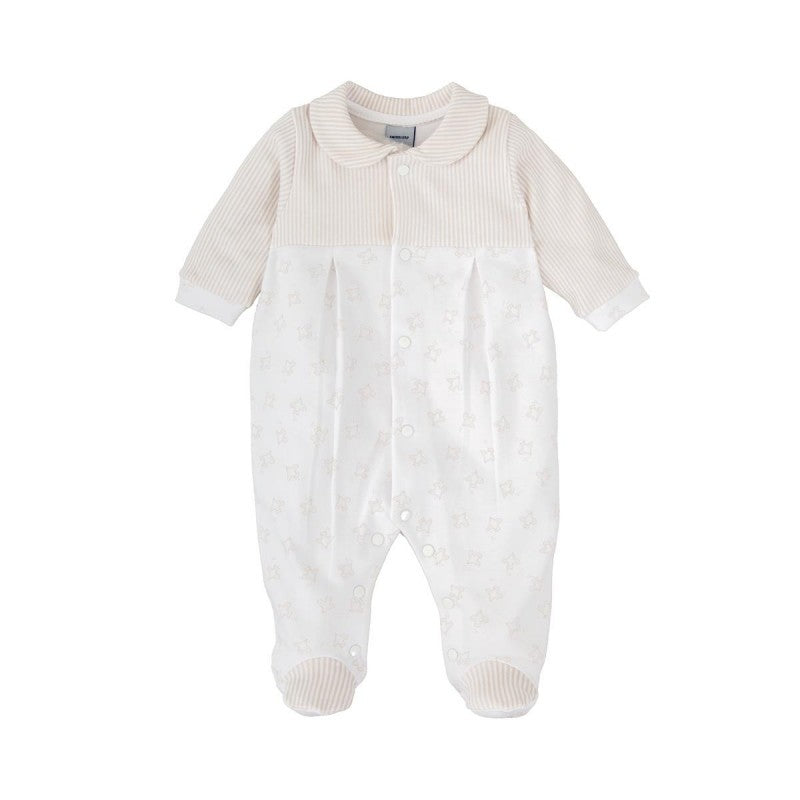 El pelele Aire para bebé en tonos neutros es la prenda ideal para mantener al pequeño cómodo y con estilo desde el primer día. Su diseño combina una parte superior de rayas beige con un cuerpo blanco decorado con un delicado estampado de pajaritos al tono. El cuello bebé, los puños y los pies en tejido rayado aportan un acabado elegante y armonioso. Gracias a su abertura completa delantera con corchetes, es práctico y fácil de poner. Perfecto para vestir con dulzura y comodidad en cualquier ocasión.