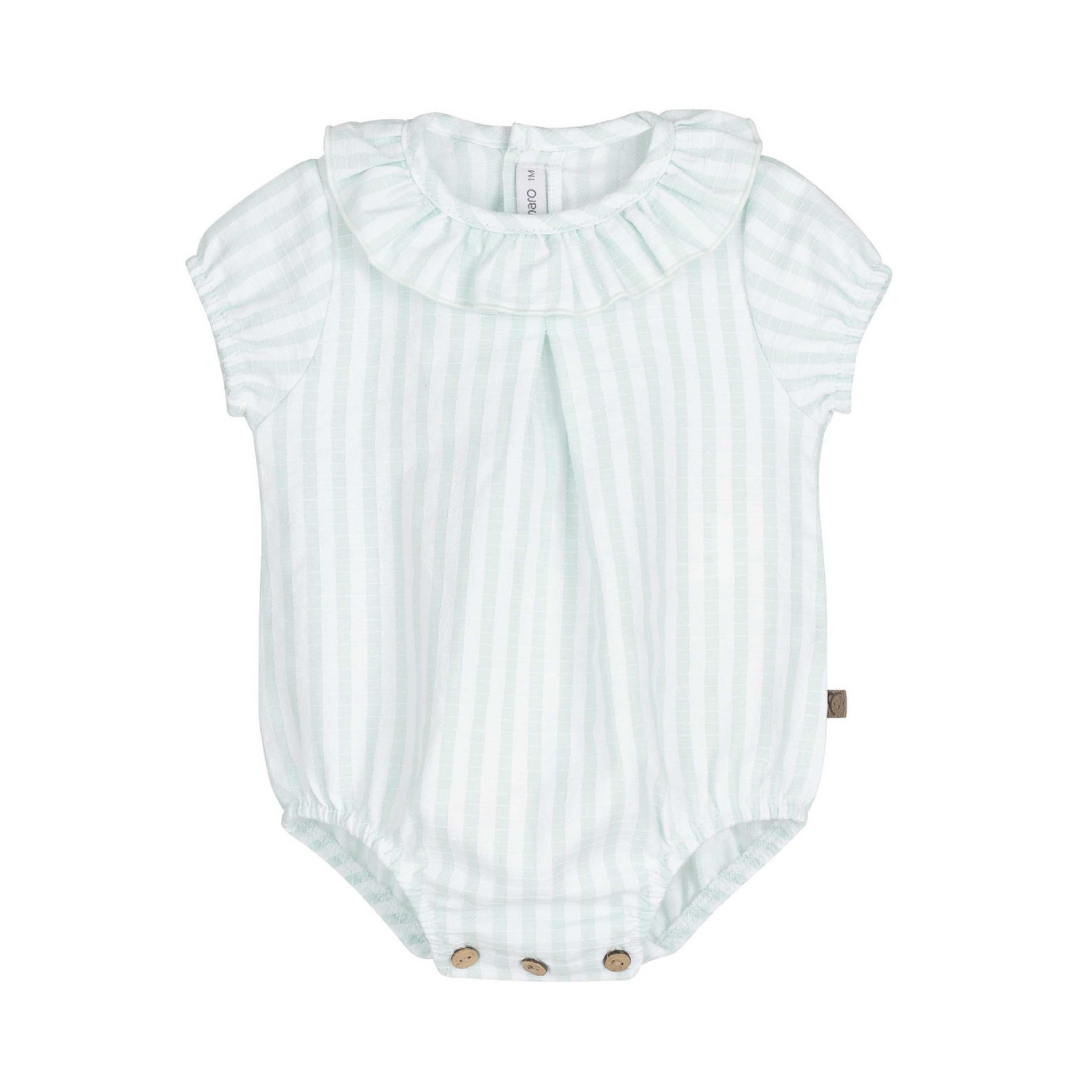 El pelele Bundi de Calamaro en color mint es una prenda delicada y cómoda, perfecta para los primeros looks del bebé. Su diseño sencillo con tejido de textura y cuello con pequeño volante aporta un toque dulce y elegante, ideal para la temporada de primavera y verano.
