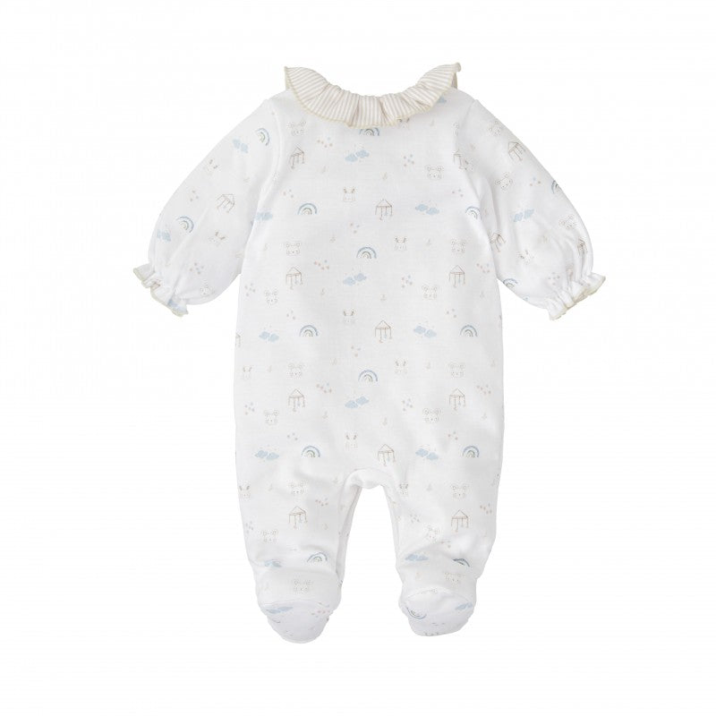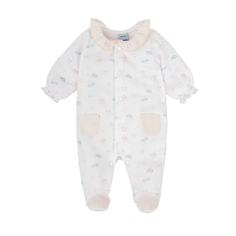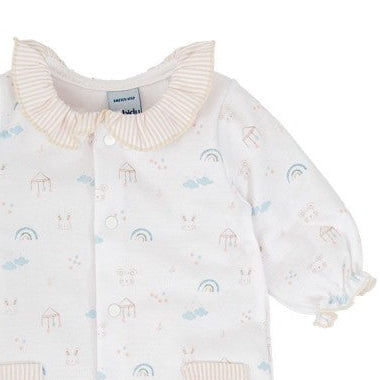 Este encantador pelele Aire de manga larga está confeccionado en algodón 100% suave y delicado con la piel del bebé. Su estampado en tonos pastel con arcoíris, nubes, casitas y caritas de animalitos aporta una estética dulce, neutra y armoniosa.