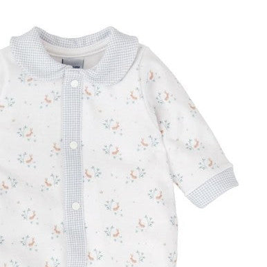 El cuello bebé, los puños, los pies y toda la tapeta frontal están confeccionados en cuadros vichy celeste, aportando un contraste elegante y delicado. Gracias a su apertura completa con corchetes delanteros, vestir y cambiar al bebé es mucho más fácil.