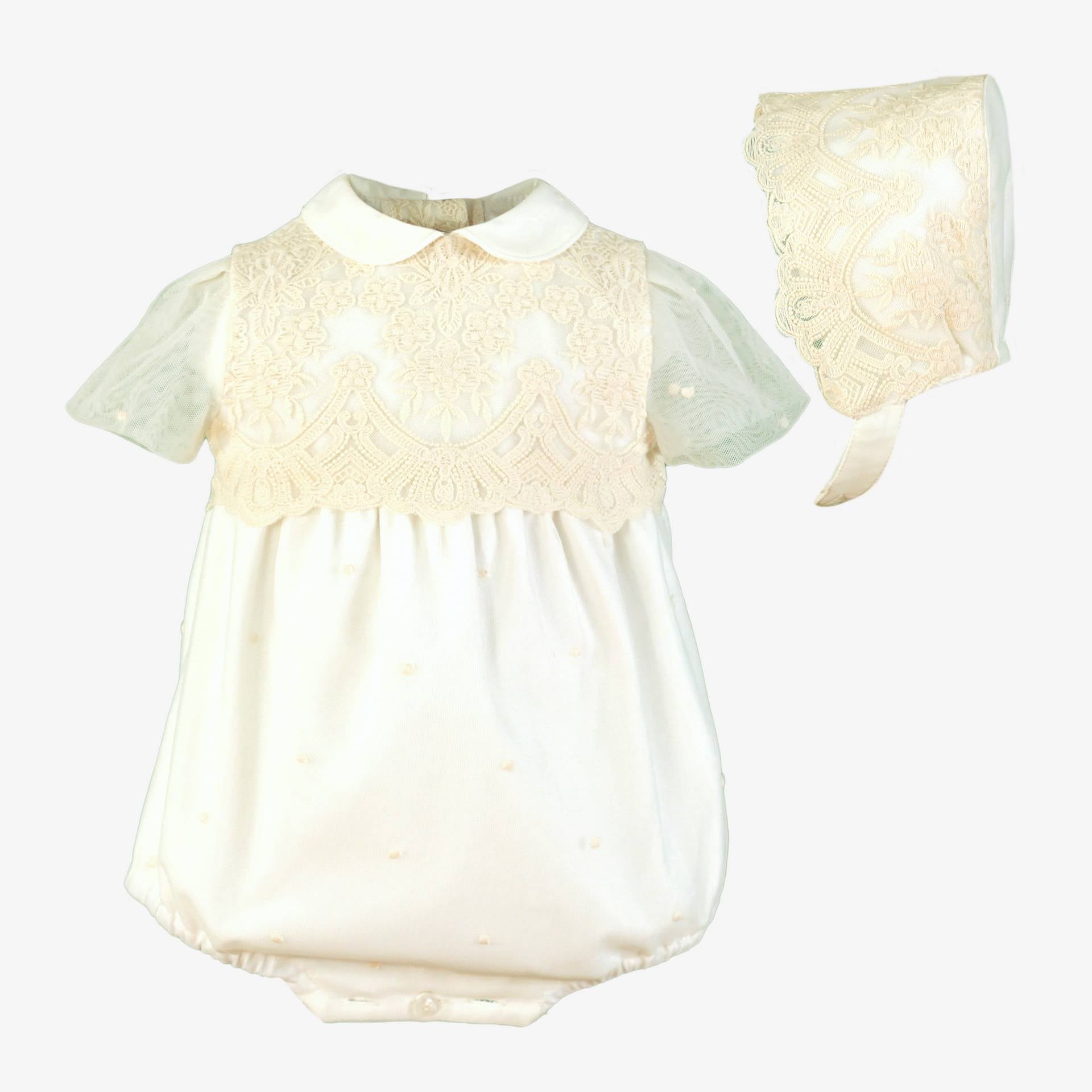 Un conjunto delicado y elegante que destaca por su estilo clásico y refinado. Este precioso pelele en tono crudo combina un cuerpo con plumeti con un espectacular canesú de encaje bordado, creando una prenda muy especial y llena de detalles.